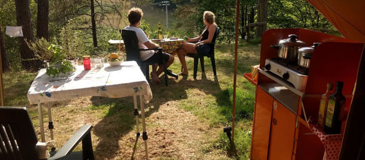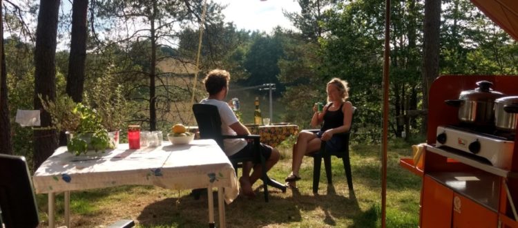 Echt ouderwets kamperen in een klein tentje, maar wel met grote luifel, een heerlijk bed met goede matrassen en een kooktoestelletje!
